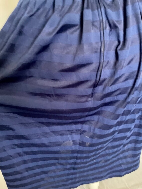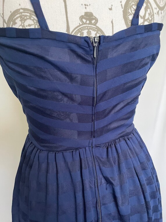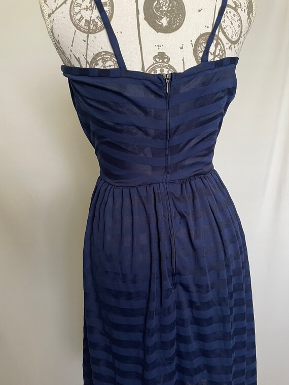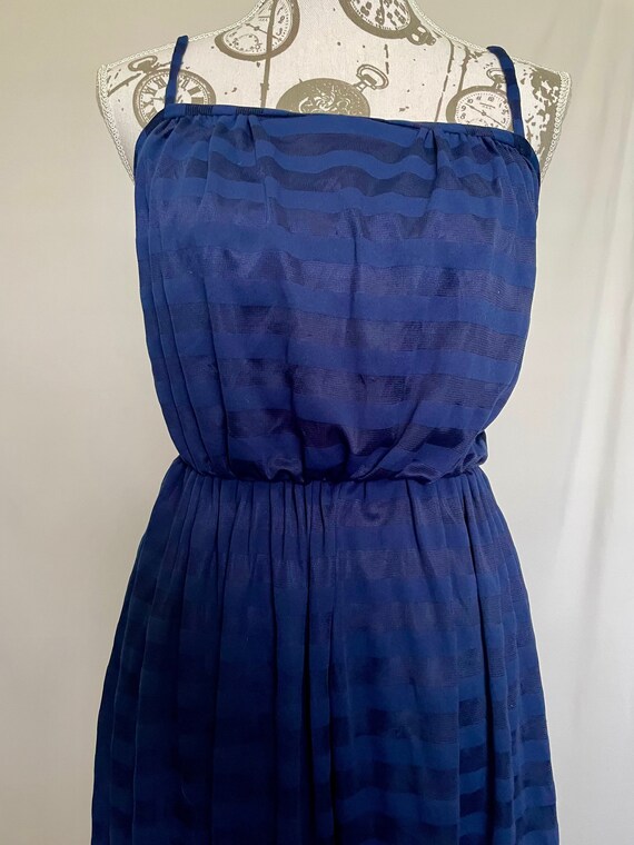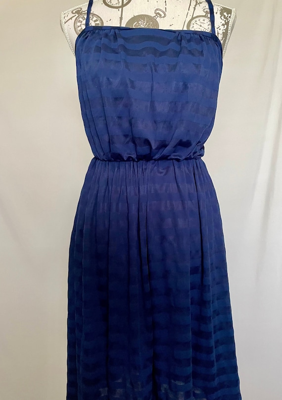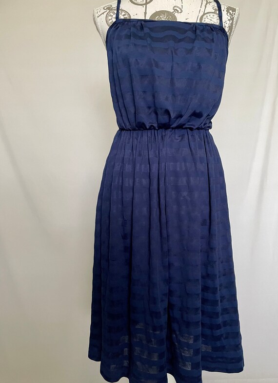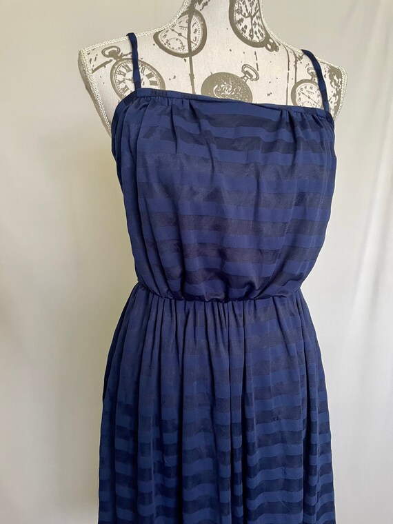 Cute, probably homemade dark blue summer dress with lovely shiny horizontal stripes. Thin straps, fitted bust and waist and a full skirt. Length is just below the knee depending on your height. Zips up the back for added structure and shape. The dress is semi-sheer in direct sun or light.